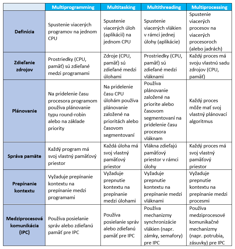 Multiprogramming | Multitasking | Multithreading | Multiprocessing | |